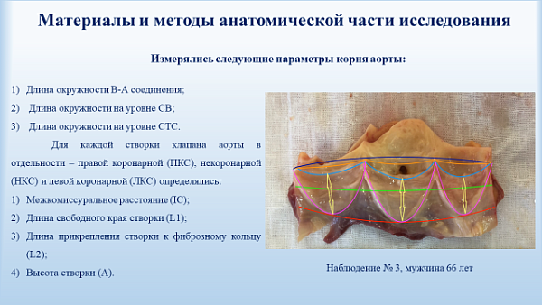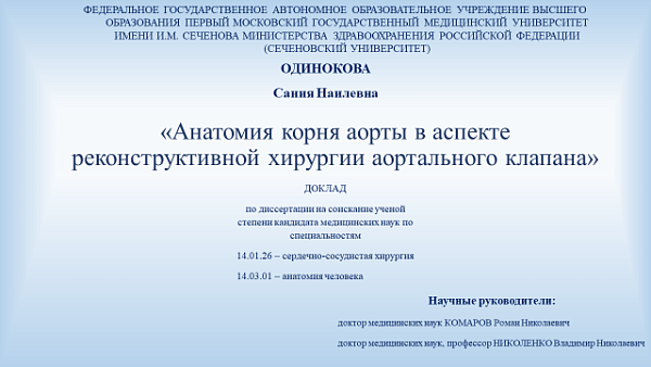Далее состоялась апробация диссертации аспирантки кафедры госпитальной хирургии третьего года обучения, и по совместительству ассистента кафедры анатомии человека, Сании Одиноковой. Тема выполненной научно-квалификационной работы «Анатомия корня аорты в аспекте реконструктивной хирургии аортального клапана». Работа носит междисциплинарный характер и рассматривает вопросы двух специальностей (14.01.26 – сердечно-сосудистая хирургия и 14.03.01 – анатомия человека). Одним из рецензентов к докладу аспирантки Одиноковой выступила профессор кафедры анатомии человека Лидия Литвиненко. Высоко оценив представленную анатомо-клиническую работу, профессор упомянула о необходимости выполнения таких междисциплинарных работ, создаваемых в коллаборации с клиническими базами. Результаты могут быть с успехом применены в практическом здравоохранении.