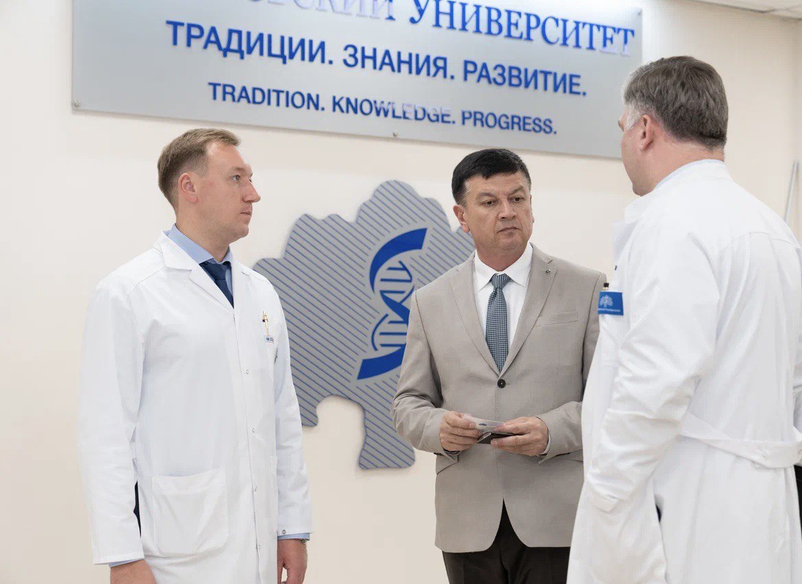 Проректор по инновационной и клинической деятельности Виктор Фомин и главный врач УКБ № 1 Валерий Роюк продемонстрировали гостям возможности университетской клинической больницы, акцент был сделан на высокотехнологичное диагностическое оборудование: МРТ, КТ, маммографы, ОФЭКТ/КТ. Стоит заметить, что подобных аппаратов ОФЭКТ/КТ (NM/CT 860) всего два на территории РФ. Сканер отличается высокой производительностью, эффективно сочетает в себе возможности ОФЭКТ и КТ.