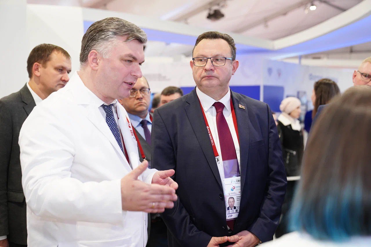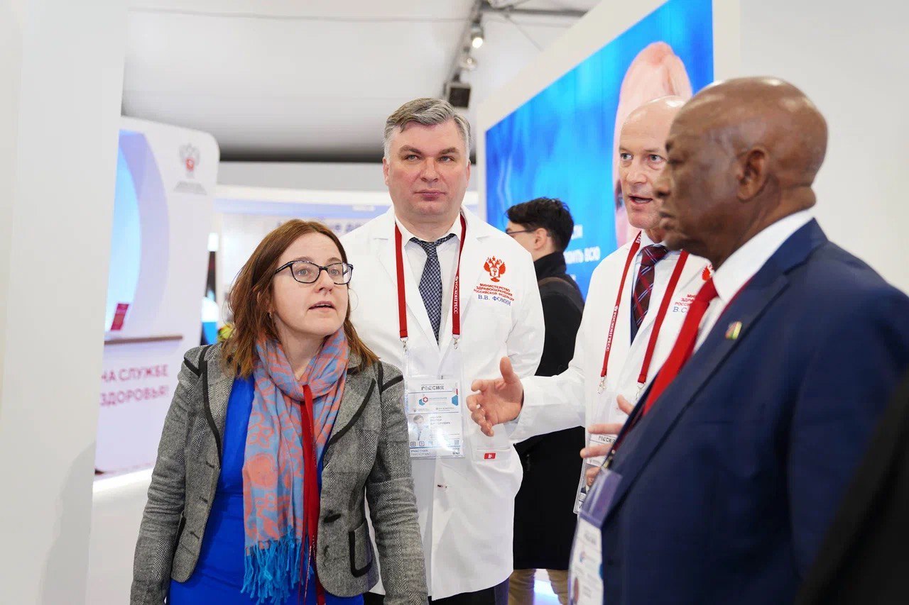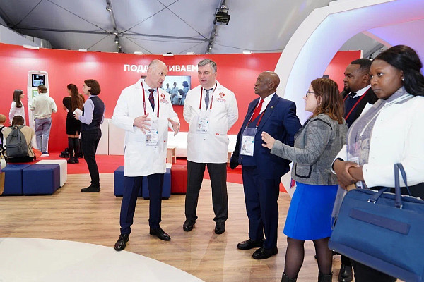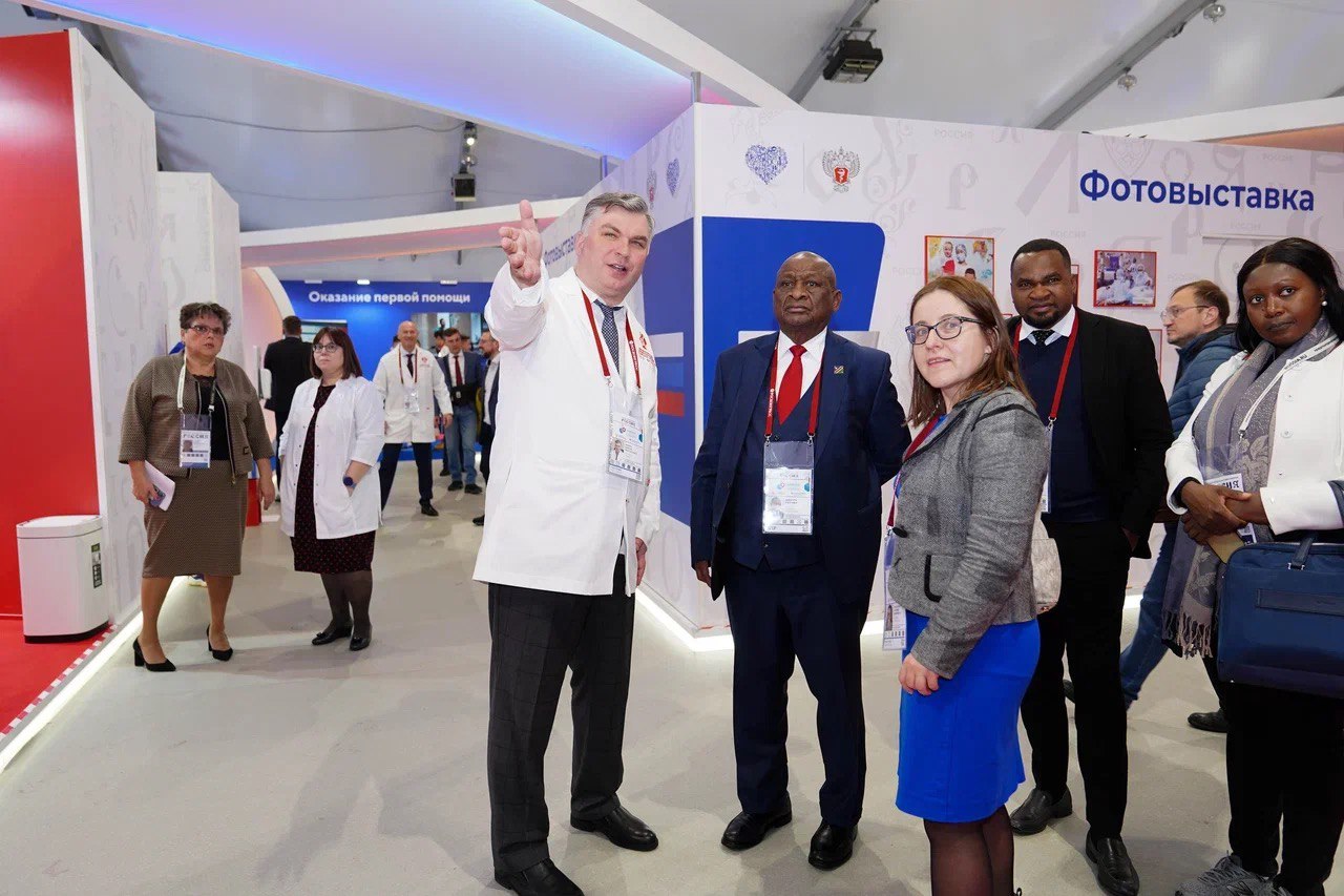 Проректор Сеченовского Университета по инновационной и клинической деятельности Виктор Фомин и первый заместитель министра здравоохранения Виктор Фисенко рассказали представителям Минздрава Республики Беларусь и Минздрава Намибии об истории, целях и достижениях российского здравоохранения в выставочном кластере «На службе здоровья!», открытом в рамках выставки-форума «Россия» на ВДНХ. Участие в экскурсии приняли в том числе министр здравоохранения Беларуси Дмитрий Пиневич и министр здравоохранения и социальных служб Намибии Калумби Шангула.