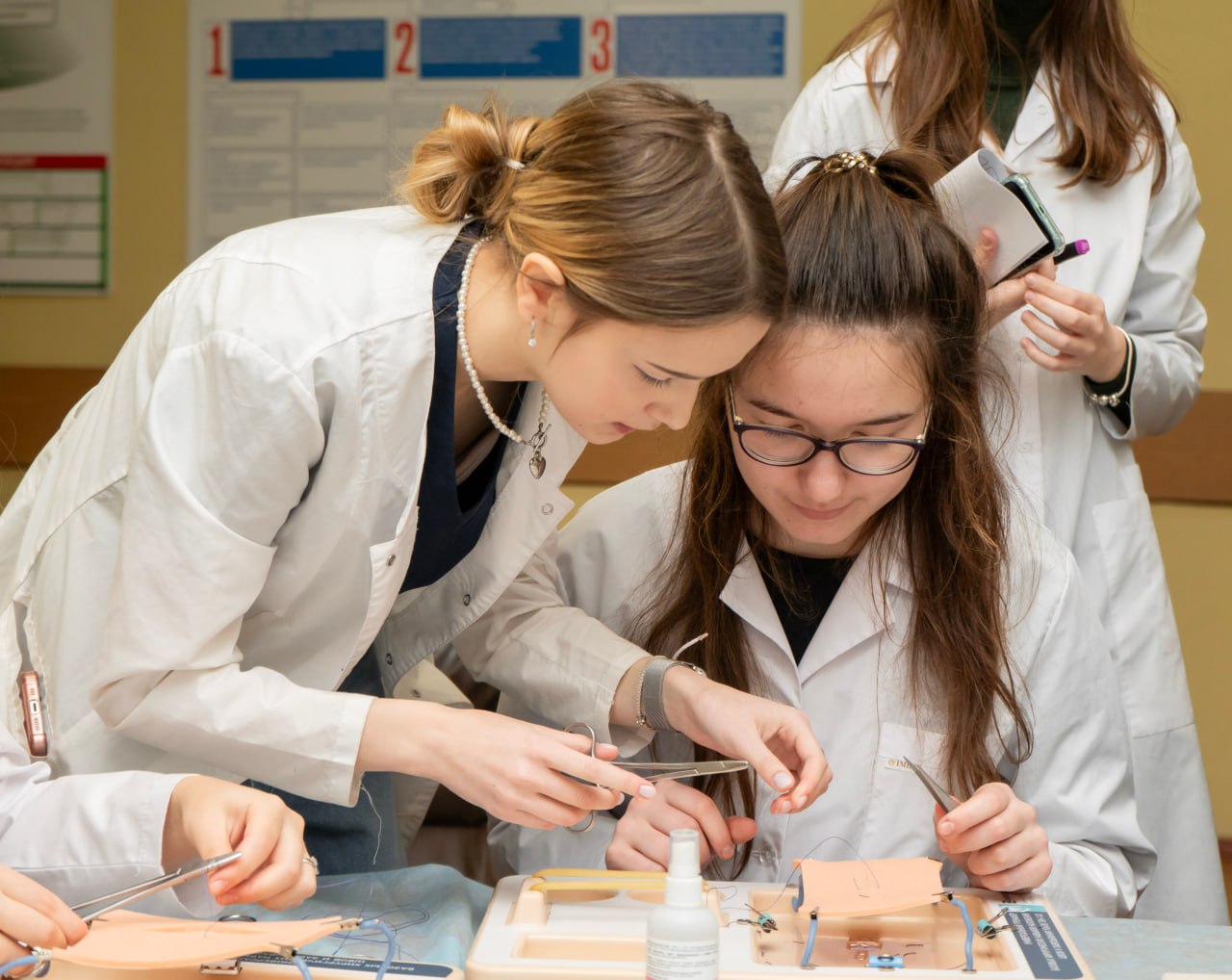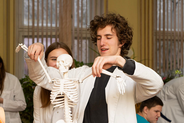 На станции хирургии у ребят была возможность пошить на настоящих тренажерах, на которых тренируются студенты: мастер-класс по хирургическому шву провели участники СНК кафедры детской хирургии и урологии-андрологии им. Л. П. Александрова. А на станции анатомии воспитанники сначала прослушали мини-лекцию, в которой все демонстрировали на макетах, а затем ответили на вопросы викторины.