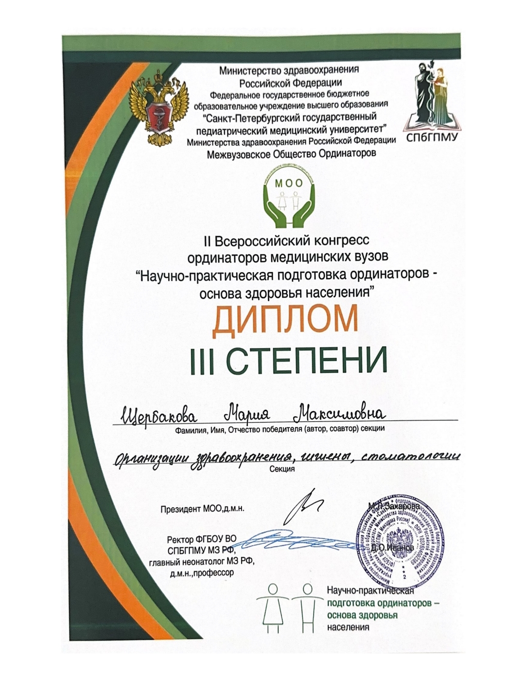 29-30 мая 2024 года в рамках ежегодного Национального конгресса с международным участием «Здоровые дети – будущее страны» прошел Всероссийский конгресс ординаторов медицинских ВУЗов «Научно-практическая подготовка ординаторов - основа здоровья населения». От нашей кафедры выступала аспирант 2 года Щербакова Мария Максимовна с докладом «Ксеростомия у подростков с сахарным диабетом 1 типа».